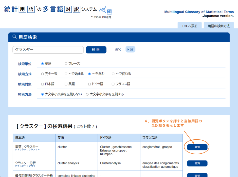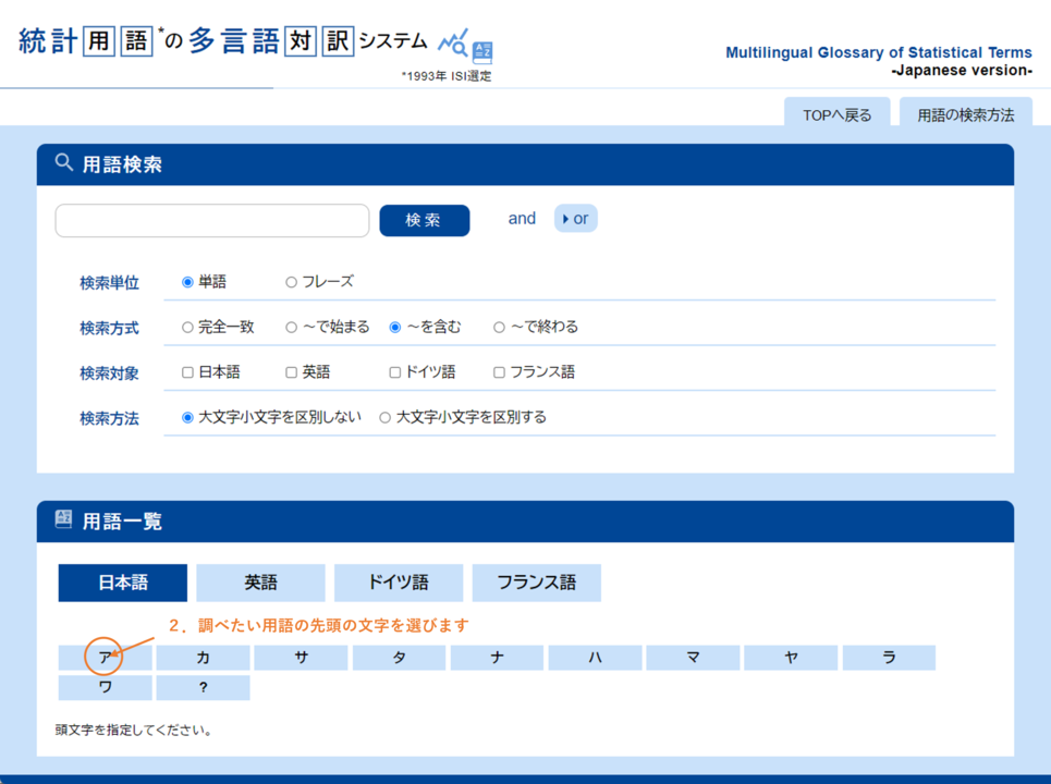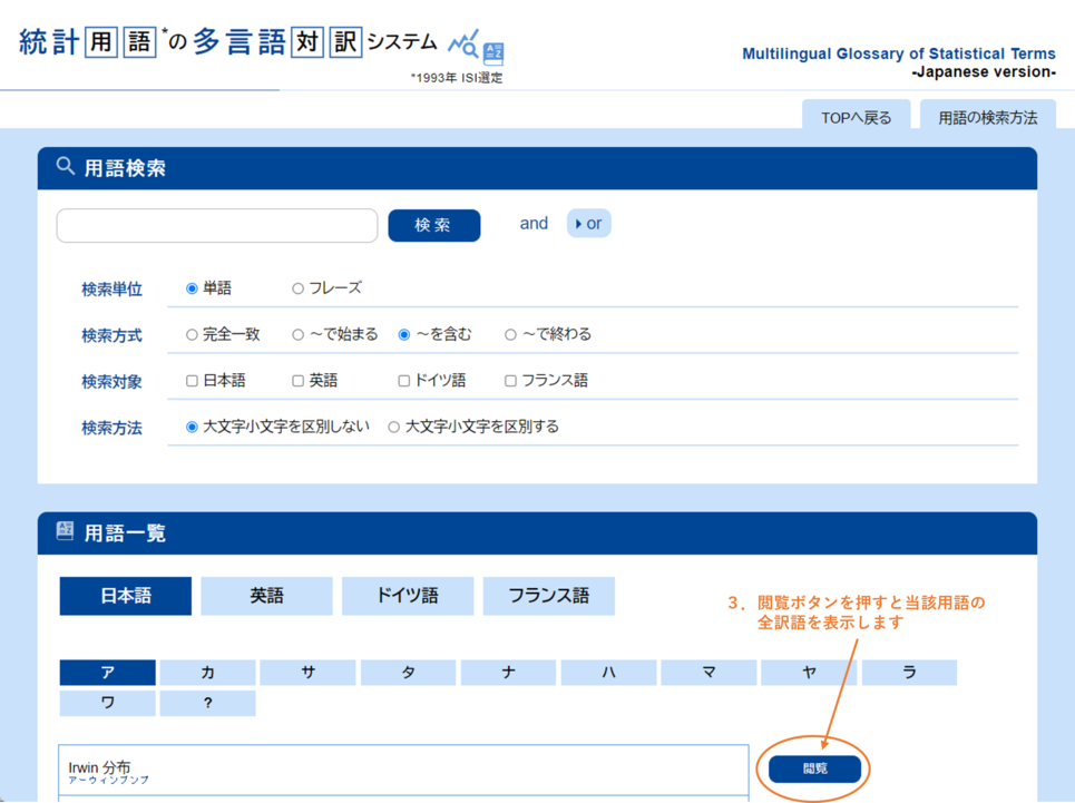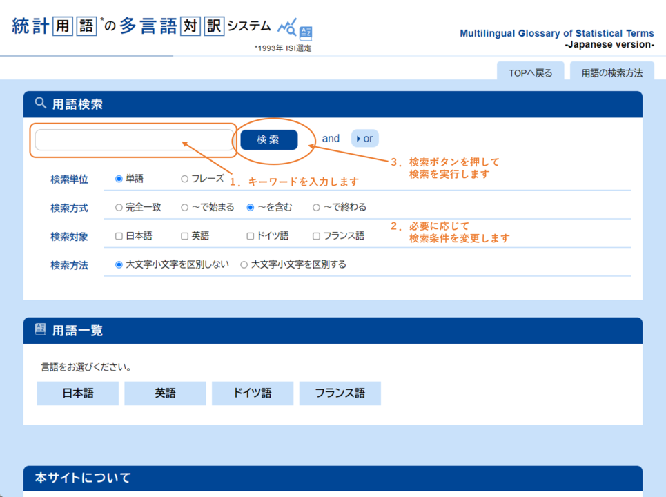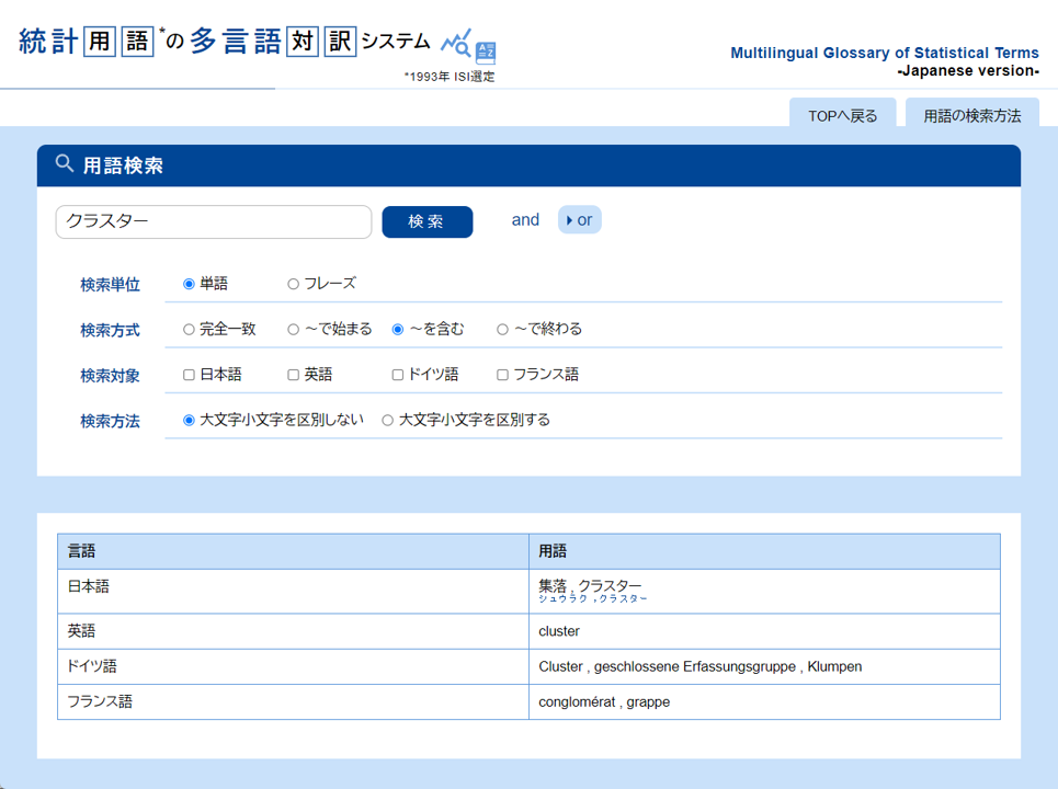 統計用語の多言語対訳システムでは、キーワード検索と用語一覧による検索の 2通り方法で単語を調べることが可能です。現在、日本語、英語、ドイツ語、フランス語の対訳が表示されます。